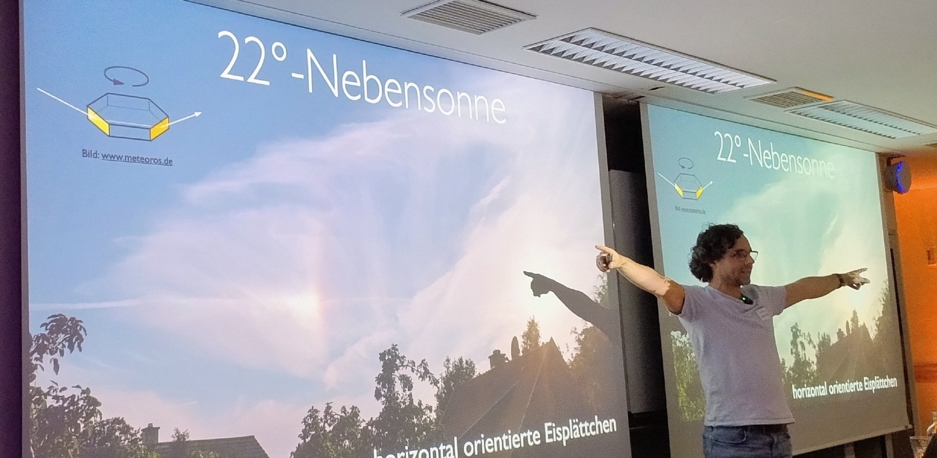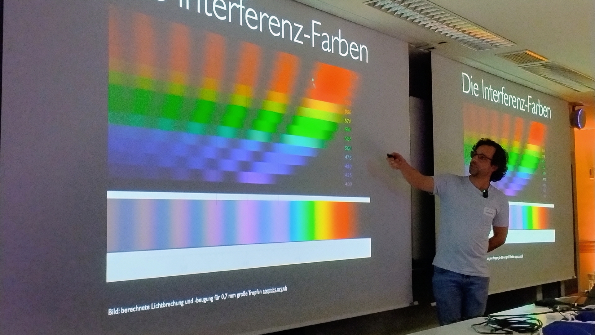 Dr. Benjamin Knispel geht es auch in diesem Vortrag um Wellen. Keine, die das Raumzeitgefüge in die Mangel nehmen, sondern die, die wir sehen. Es darum, welche Phänomene Licht in unserer Atmosphäre verursacht. Denn es gibt weit mehr zu sehen, als den Regenbogen.